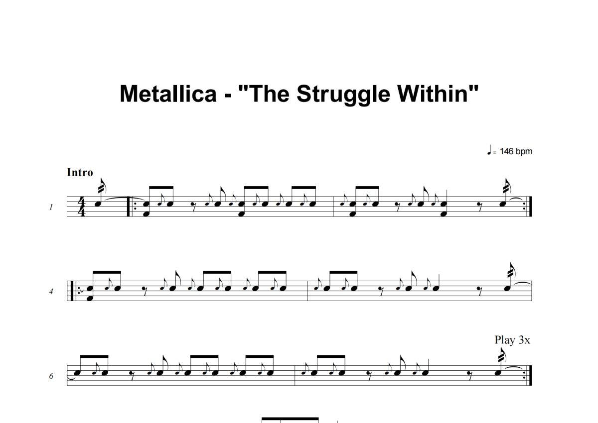 《The Struggle Within》是Metallica演唱的一首歌曲,这份架子鼓谱共有七张高清图谱,图谱由 @失眠的土豆 编配上传,图谱使用五线谱编配,使用这份The Struggle Within架子鼓谱,你将能够轻松地敲打出这首Metallica的The Struggle Within,快来尝试吧。