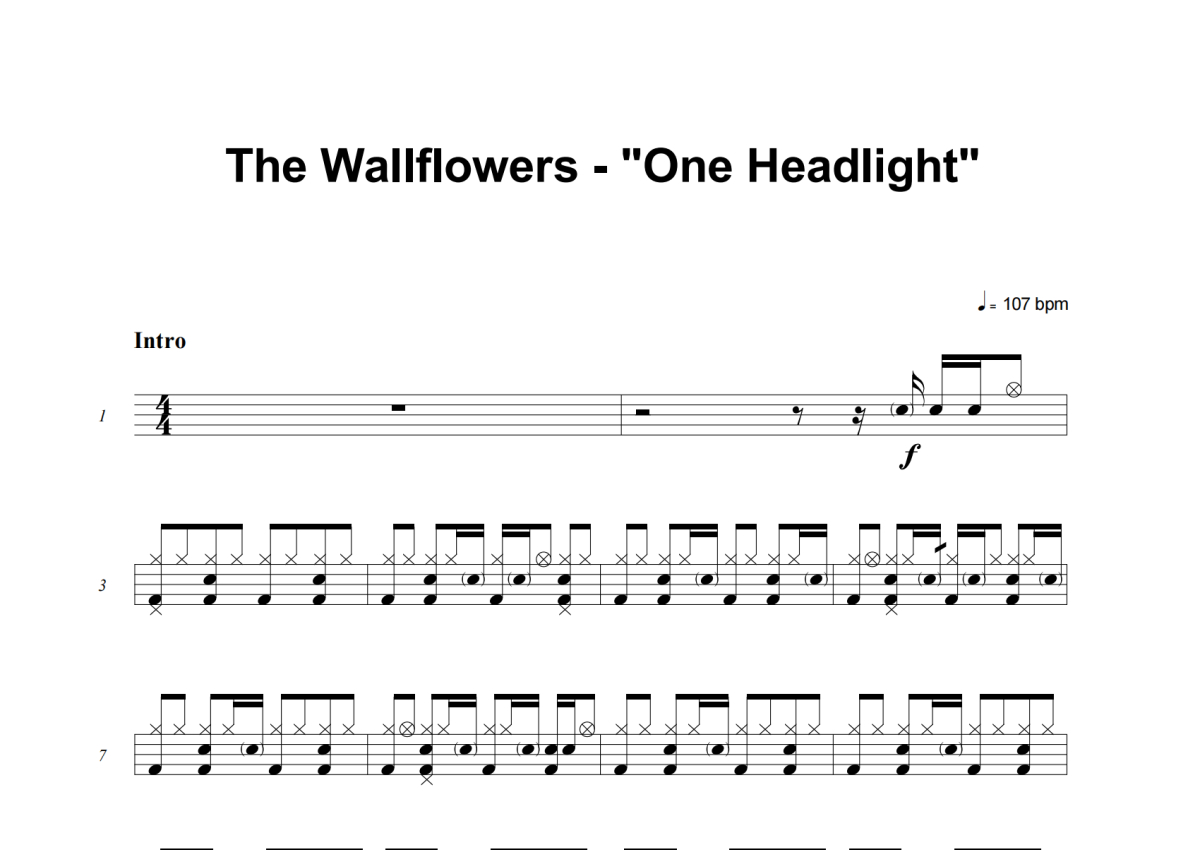 《One Headlight》是The Wallflowers演唱的一首歌曲,这份架子鼓谱共有五张高清图谱,图谱由 @失眠的土豆 编配上传,图谱使用五线谱编配,使用这份One Headlight架子鼓谱,你将能够轻松地敲打出这首The Wallflowers的One Headlight,快来尝试吧。