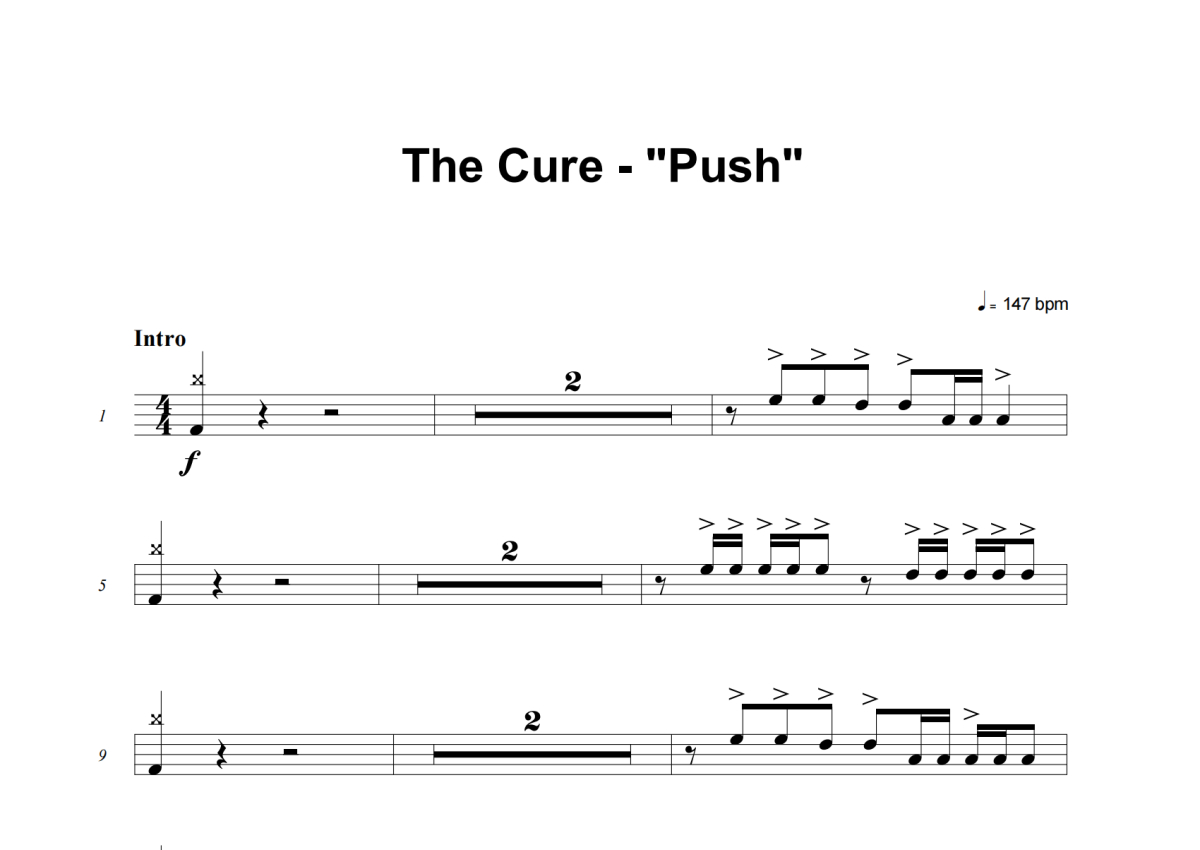 《Push》是The Cure演唱的一首歌曲,这份架子鼓谱共有五张高清图谱,图谱由 @失眠的土豆 编配上传,图谱使用五线谱编配,使用这份Push架子鼓谱,你将能够轻松地敲打出这首The Cure的Push,快来尝试吧。