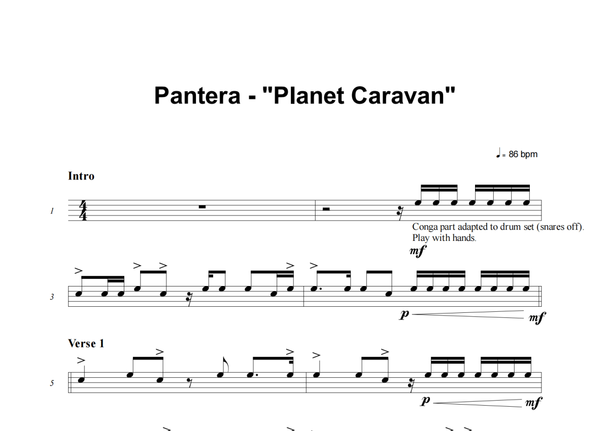 《Planet Caravan》是Pantera演唱的一首歌曲,这份架子鼓谱共有五张高清图谱,图谱由 @失眠的土豆 编配上传,图谱使用五线谱编配,使用这份Planet Caravan架子鼓谱,你将能够轻松地敲打出这首Pantera的Planet Caravan,快来尝试吧。