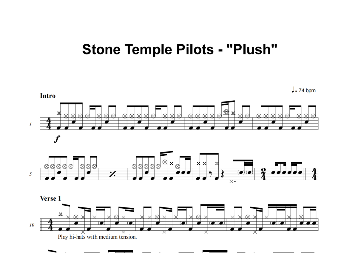 《Plush》是Stone Temple Pilots演唱的一首歌曲,这份架子鼓谱共有五张高清图谱,图谱由 @失眠的土豆 编配上传,图谱使用五线谱编配,使用这份Plush架子鼓谱,你将能够轻松地敲打出这首Stone Temple Pilots的Plush,快来尝试吧。