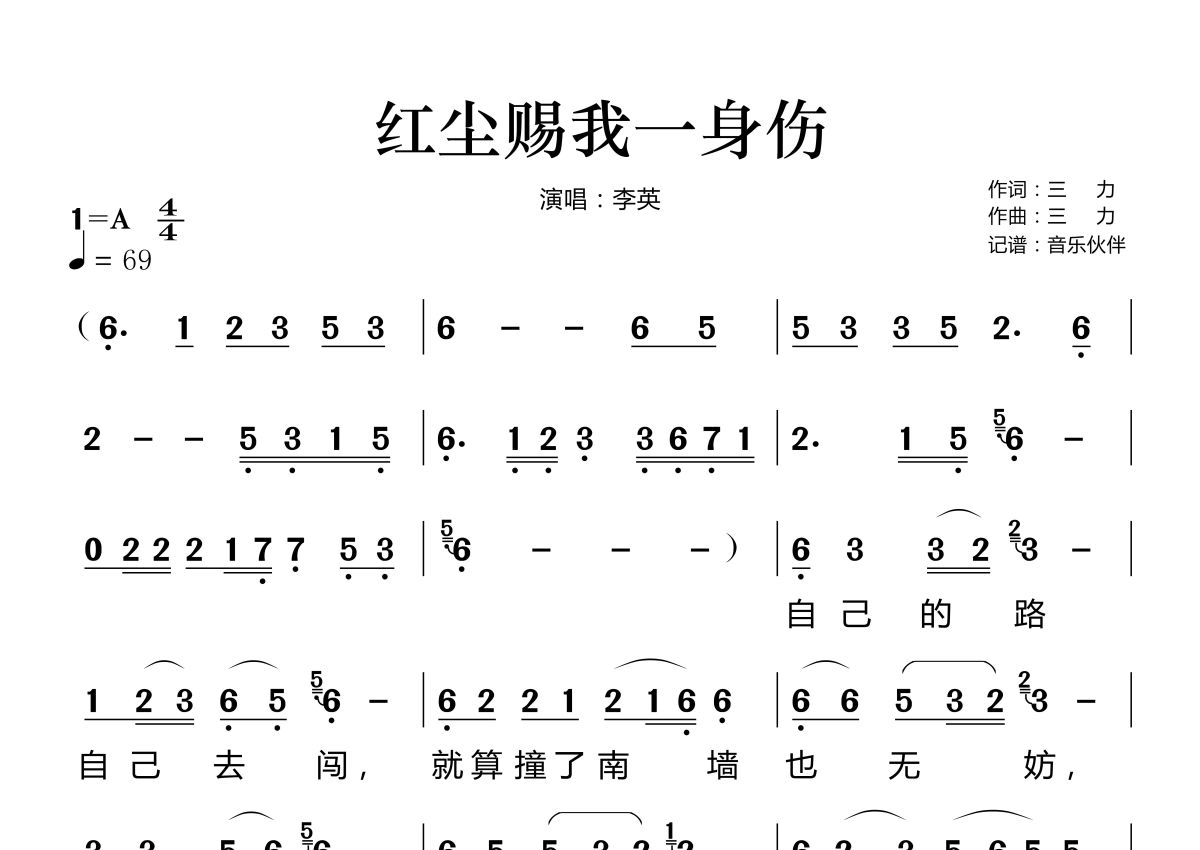 《红尘赐我一身伤》是李英演唱的一首歌曲,拍号为4/4拍,歌曲速度为每分钟69拍,这份简谱共有两张高清图谱,图谱由 @音乐伙伴 编配上传。