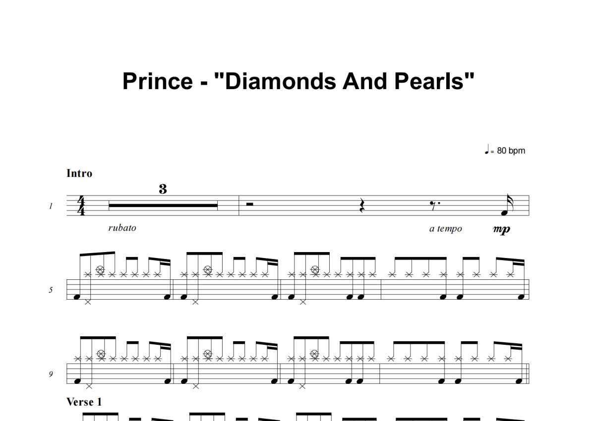 《Diamonds And Pearls》是Prince演唱的一首歌曲,这份架子鼓谱共有四张高清图谱,图谱由 @失眠的土豆 编配上传,图谱使用五线谱编配,使用这份Diamonds And Pearls架子鼓谱,你将能够轻松地敲打出这首Prince的Diamonds And Pearls,快来尝试吧。