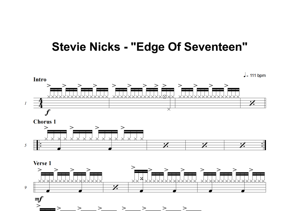 《Edge Of Seventeen》是Stevie Nicks演唱的一首歌曲,这份架子鼓谱共有五张高清图谱,图谱由 @失眠的土豆 编配上传,图谱使用五线谱编配,使用这份Edge Of Seventeen架子鼓谱,你将能够轻松地敲打出这首Stevie Nicks的Edge Of Seventeen,快来尝试吧。