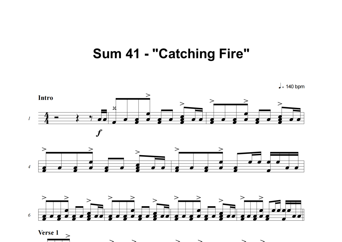 《Catching Fire》是Sum 41演唱的一首歌曲,这份架子鼓谱共有五张高清图谱,图谱由 @失眠的土豆 编配上传,图谱使用五线谱编配,使用这份Catching Fire架子鼓谱,你将能够轻松地敲打出这首Sum 41的Catching Fire,快来尝试吧。