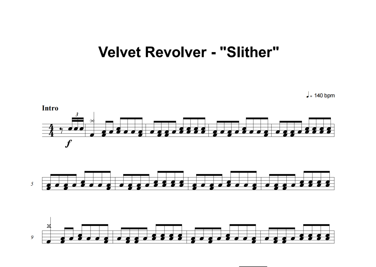 《Slither》是Velvet Revolver演唱的一首歌曲,这份架子鼓谱共有五张高清图谱,图谱由 @失眠的土豆 编配上传,图谱使用五线谱编配,使用这份Slither架子鼓谱,你将能够轻松地敲打出这首Velvet Revolver的Slither,快来尝试吧。