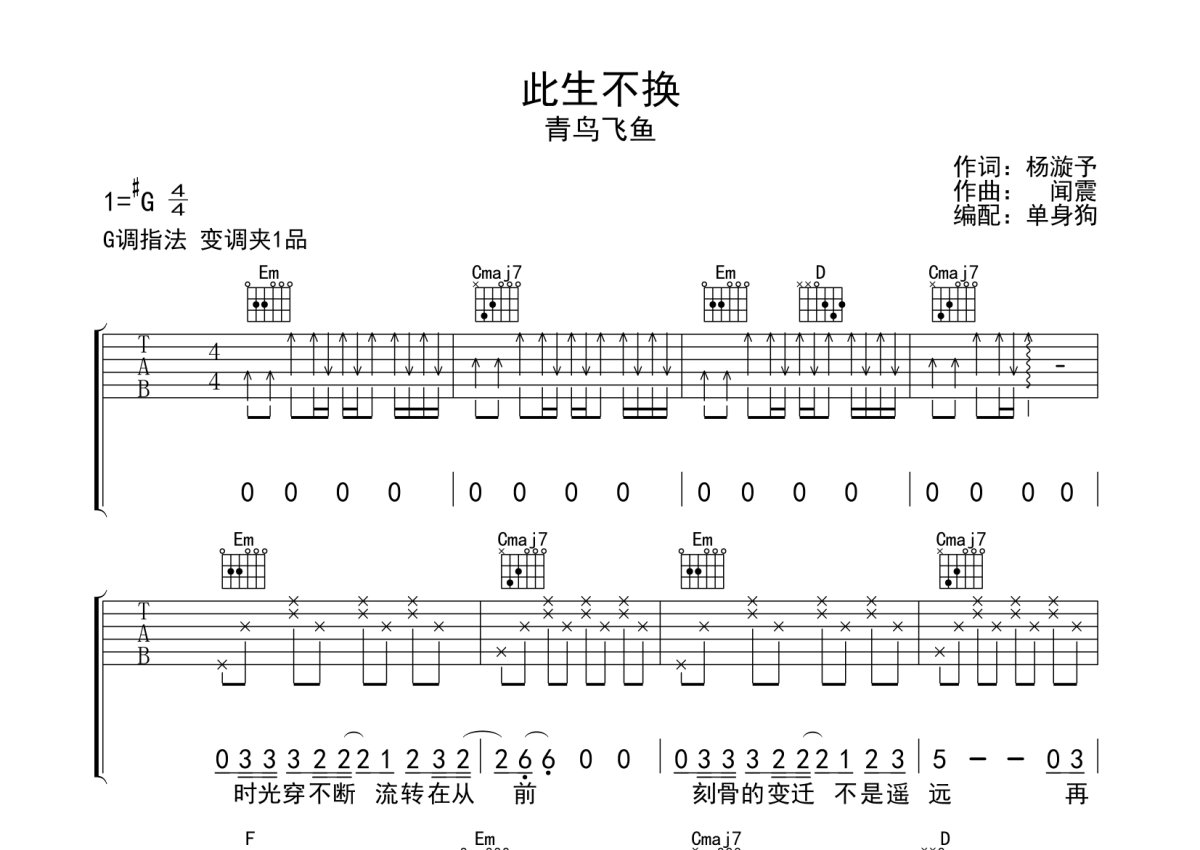 《此生不换》是青鸟飞鱼演唱的一首歌曲,本吉他谱采用的是G调指法编配,这份吉他谱共有三张高清图谱,图谱由 @单身狗 编配上传,图谱使用六线谱编配,包含吉他和弦指法、简谱以及歌词部分,使用这份此生不换吉他谱,可以让你更加方便地掌握这首歌曲的弹唱技巧,快来尝试吧。青鸟飞鱼《此生不换》吉他弹唱谱,采用G调指法编配,单身狗编配出品,共有3张高清图谱。