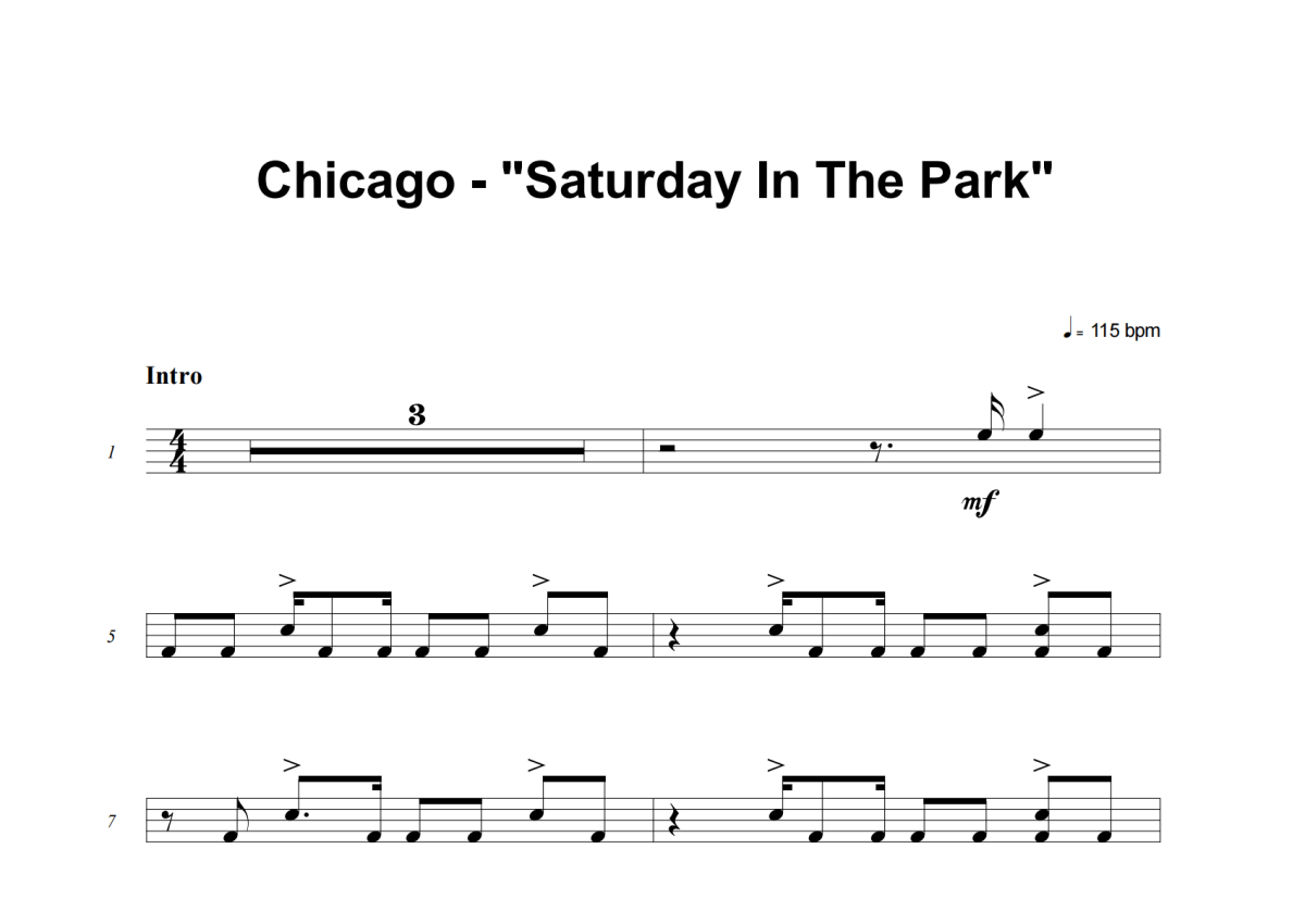 《Saturday In The Park》是Chicago演唱的一首歌曲,这份架子鼓谱共有六张高清图谱,图谱由 @失眠的土豆 编配上传,图谱使用五线谱编配,使用这份Saturday In The Park架子鼓谱,你将能够轻松地敲打出这首Chicago的Saturday In The Park,快来尝试吧。