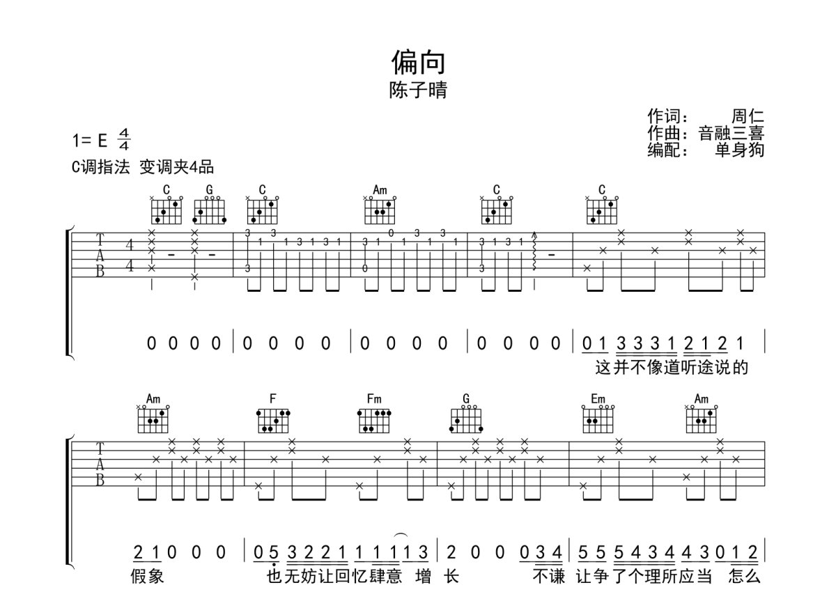 陈子晴《偏向》吉他谱 - C调弹唱六线谱