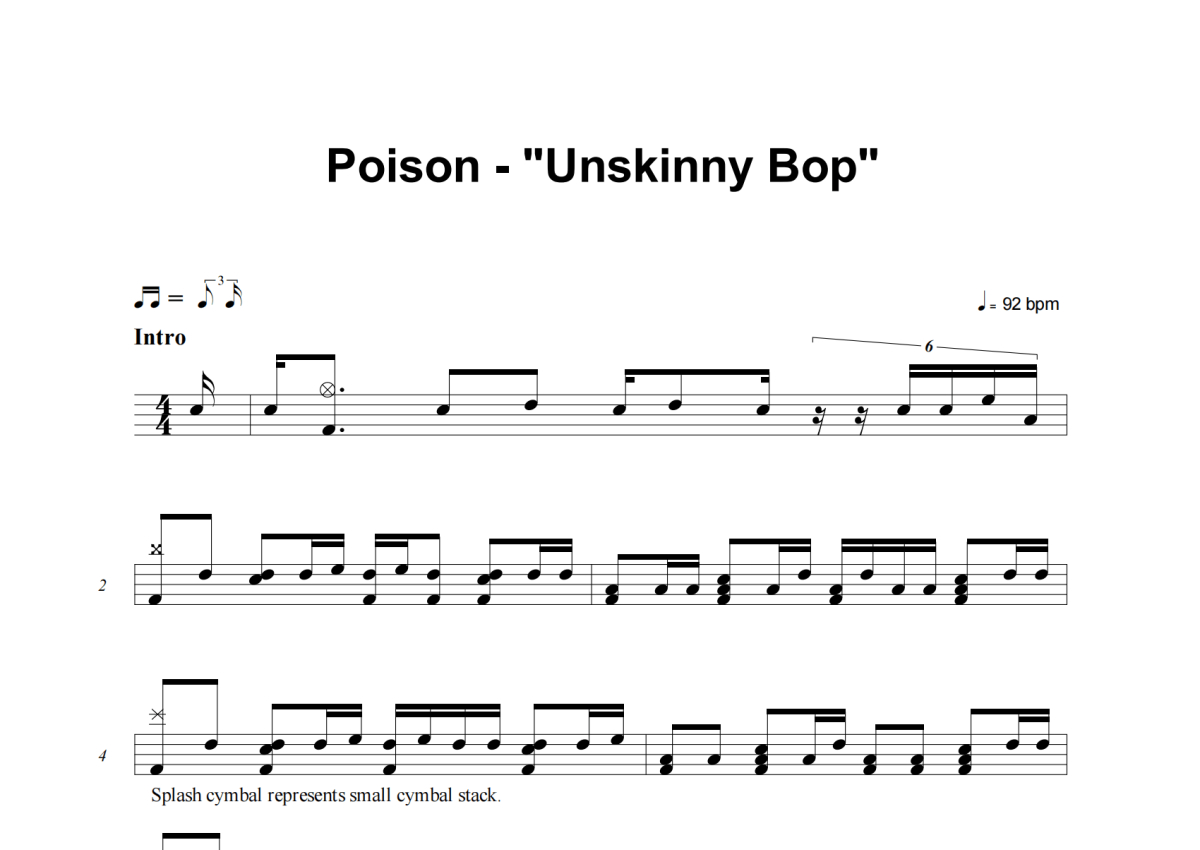 《Unskinny Bop》是Poison演唱的一首歌曲,这份架子鼓谱共有五张高清图谱,图谱由 @失眠的土豆 编配上传,图谱使用五线谱编配,使用这份Unskinny Bop架子鼓谱,你将能够轻松地敲打出这首Poison的Unskinny Bop,快来尝试吧。