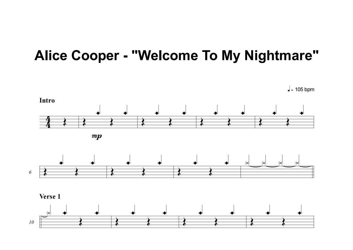 《Welcome To My Nightmare》是Alice Cooper演唱的一首歌曲,这份架子鼓谱共有五张高清图谱,图谱由 @失眠的土豆 编配上传,图谱使用五线谱编配,使用这份Welcome To My Nightmare架子鼓谱,你将能够轻松地敲打出这首Alice Cooper的Welcome To My Nightmare,快来尝试吧。