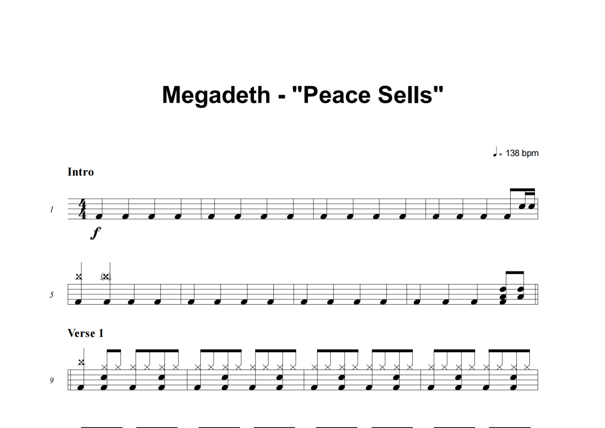《Peace Sells》是Megadeth演唱的一首歌曲,这份架子鼓谱共有六张高清图谱,图谱由 @失眠的土豆 编配上传,图谱使用五线谱编配,使用这份Peace Sells架子鼓谱,你将能够轻松地敲打出这首Megadeth的Peace Sells,快来尝试吧。