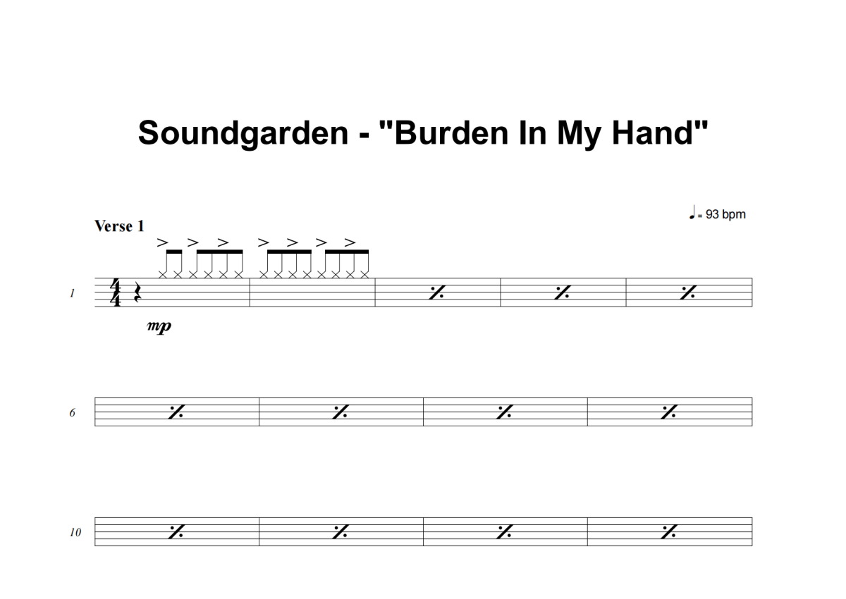《Burden In My Hand》是Soundgarden演唱的一首歌曲,这份架子鼓谱共有六张高清图谱,图谱由 @失眠的土豆 编配上传,图谱使用五线谱编配,使用这份Burden In My Hand架子鼓谱,你将能够轻松地敲打出这首Soundgarden的Burden In My Hand,快来尝试吧。