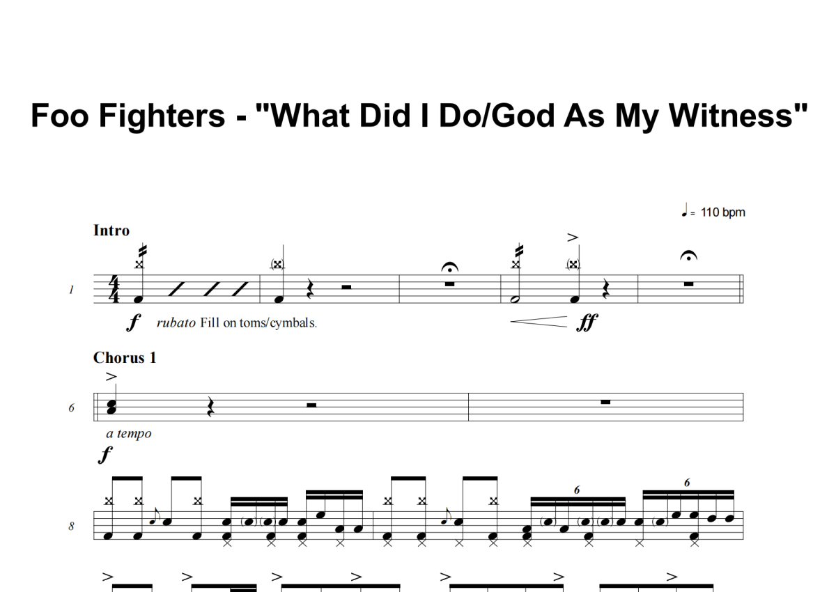 《What Did I Do__God As My Witness》是Foo Fighters演唱的一首歌曲,这份架子鼓谱共有六张高清图谱,图谱由 @失眠的土豆 编配上传,图谱使用五线谱编配,使用这份What Did I Do__God As My Witness架子鼓谱,你将能够轻松地敲打出这首Foo Fighters的What Did I Do__God As My Witness,快来尝试吧。