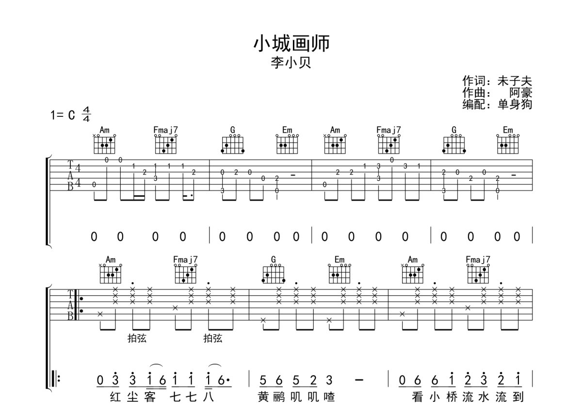 李小贝《小城画师》吉他谱 - C调弹唱六线谱