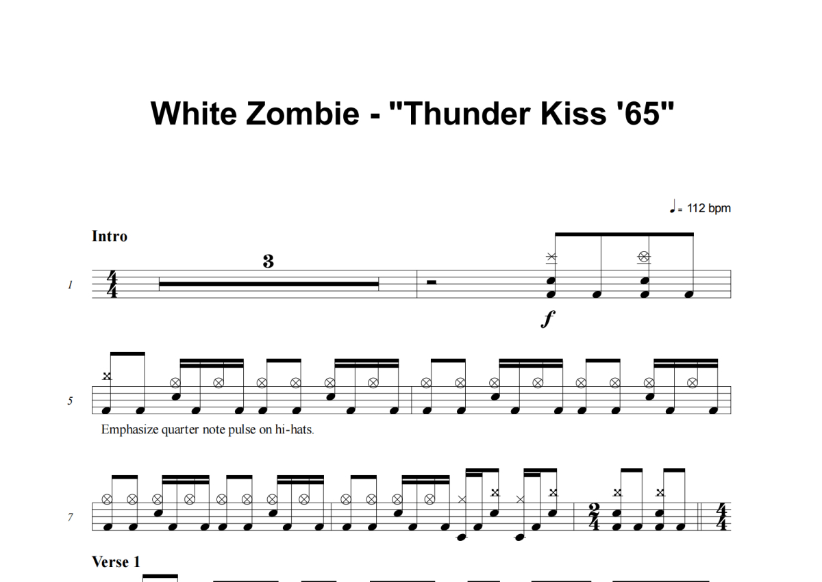 《Thunder Kiss '65》是White Zombie演唱的一首歌曲,这份架子鼓谱共有六张高清图谱,图谱由 @失眠的土豆 编配上传,图谱使用五线谱编配,使用这份Thunder Kiss '65架子鼓谱,你将能够轻松地敲打出这首White Zombie的Thunder Kiss '65,快来尝试吧。