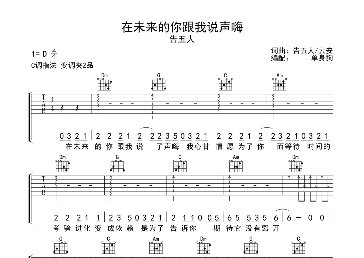 《在未来的你跟我说声嗨》是告五人演唱的一首歌曲,本吉他谱采用的是C调指法编配,这份吉他谱共有三张高清图谱,图谱由 @单身狗 编配上传,图谱使用六线谱编配,包含吉他和弦指法、简谱以及歌词部分,使用这份在未来的你跟我说声嗨吉他谱,可以让你更加方便地掌握这首歌曲的弹唱技巧,快来尝试吧。告五人《在未来的你跟我说声嗨》吉他弹唱谱,采用C调指法编配,单身狗编配出品,共有3张高清图谱。