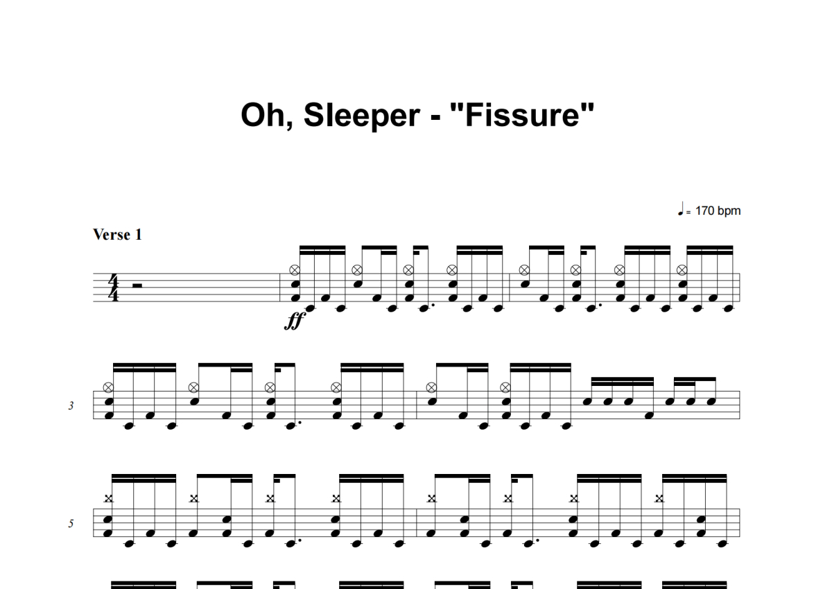 《Fissure》是Oh, Sleeper演唱的一首歌曲,这份架子鼓谱共有六张高清图谱,图谱由 @失眠的土豆 编配上传,图谱使用五线谱编配,使用这份Fissure架子鼓谱,你将能够轻松地敲打出这首Oh, Sleeper的Fissure,快来尝试吧。