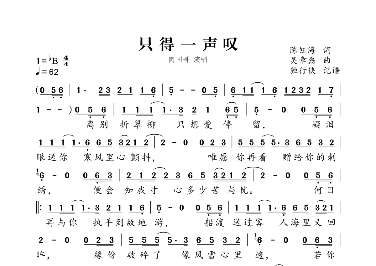 《只得一声叹》是阿国哥演唱的一首歌曲,拍号为4/4拍,歌曲速度为每分钟62拍,这份简谱共有一张高清图谱,图谱由 @独行侠 编配上传。