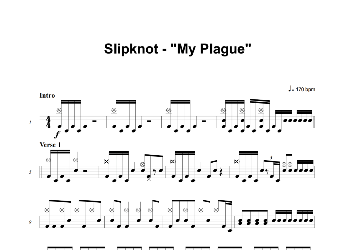 《My Plague》是Slipknot演唱的一首歌曲,这份架子鼓谱共有五张高清图谱,图谱由 @失眠的土豆 编配上传,图谱使用五线谱编配,使用这份My Plague架子鼓谱,你将能够轻松地敲打出这首Slipknot的My Plague,快来尝试吧。