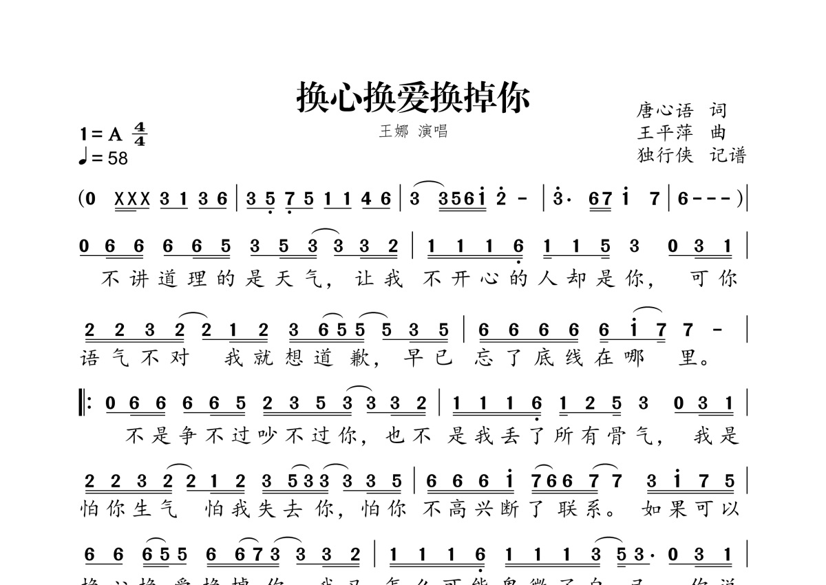 《换心换爱换掉你》是王娜演唱的一首歌曲,拍号为4/4拍,歌曲速度为每分钟57拍,这份简谱共有一张高清图谱,图谱由 @独行侠 编配上传。
