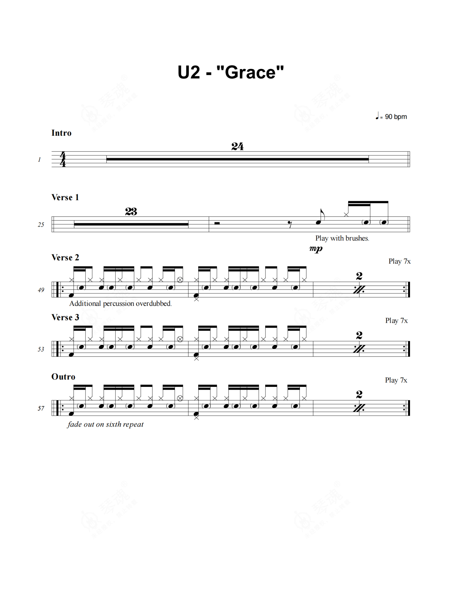 《Grace》是U2演唱的一首歌曲,这份架子鼓谱共有一张高清图谱,图谱由 @失眠的土豆 编配上传,图谱使用五线谱编配,使用这份Grace架子鼓谱,你将能够轻松地敲打出这首U2的Grace,快来尝试吧。