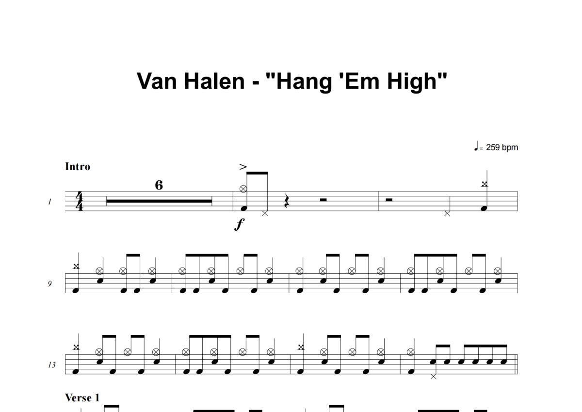 《Hang ‘em High》是Van Halen演唱的一首歌曲,这份架子鼓谱共有六张高清图谱,图谱由 @失眠的土豆 编配上传,图谱使用五线谱编配,使用这份Hang ‘em High架子鼓谱,你将能够轻松地敲打出这首Van Halen的Hang ‘em High,快来尝试吧。