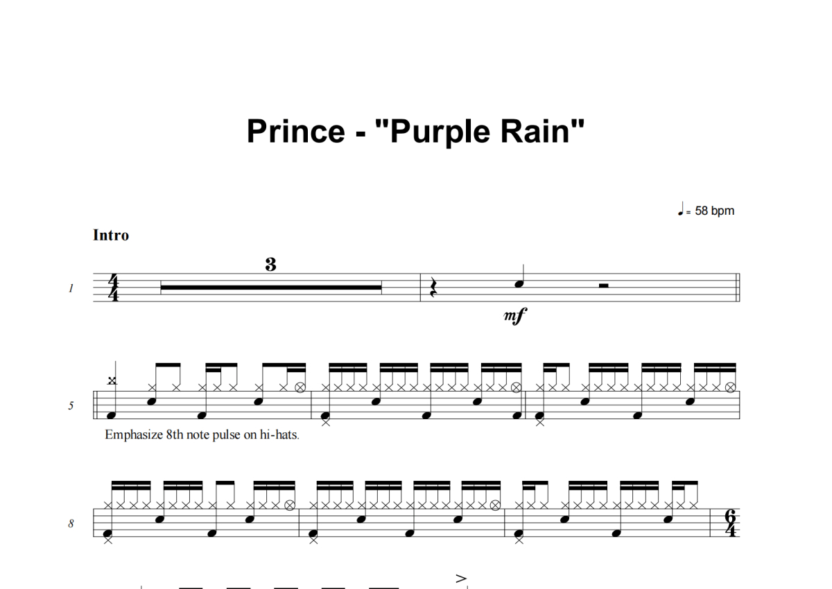 《Purple Rain》是Prince演唱的一首歌曲,这份架子鼓谱共有六张高清图谱,图谱由 @失眠的土豆 编配上传,图谱使用五线谱编配,使用这份Purple Rain架子鼓谱,你将能够轻松地敲打出这首Prince的Purple Rain,快来尝试吧。
