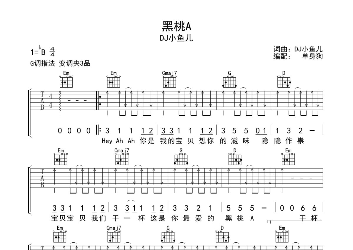 《黑桃A》是DJ小鱼儿演唱的一首歌曲,本吉他谱采用的是G调指法编配,这份吉他谱共有三张高清图谱,图谱由 @单身狗 编配上传,图谱使用六线谱编配,包含吉他和弦指法、简谱以及歌词部分,使用这份黑桃A吉他谱,可以让你更加方便地掌握这首歌曲的弹唱技巧,快来尝试吧。DJ小鱼儿《黑桃A》吉他弹唱谱,采用G调指法编配,单身狗编配出品,共有3张高清图谱。