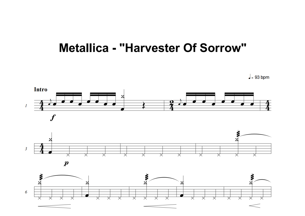《Harvester Of Sorrow》是Metallica演唱的一首歌曲,这份架子鼓谱共有五张高清图谱,图谱由 @失眠的土豆 编配上传,图谱使用五线谱编配,使用这份Harvester Of Sorrow架子鼓谱,你将能够轻松地敲打出这首Metallica的Harvester Of Sorrow,快来尝试吧。