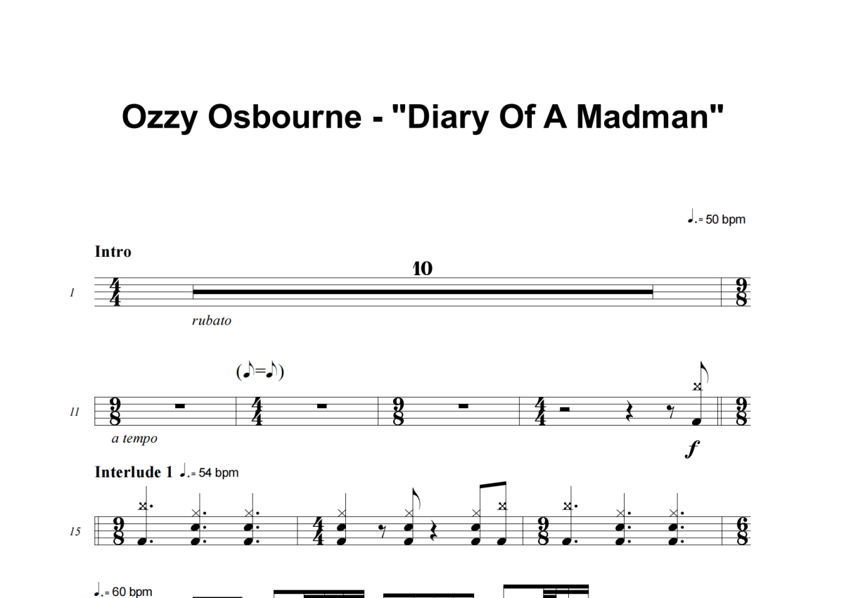 《Diary Of A Madman》是Ozzy Osbourne演唱的一首歌曲,这份架子鼓谱共有五张高清图谱,图谱由 @失眠的土豆 编配上传,图谱使用五线谱编配,使用这份Diary Of A Madman架子鼓谱,你将能够轻松地敲打出这首Ozzy Osbourne的Diary Of A Madman,快来尝试吧。