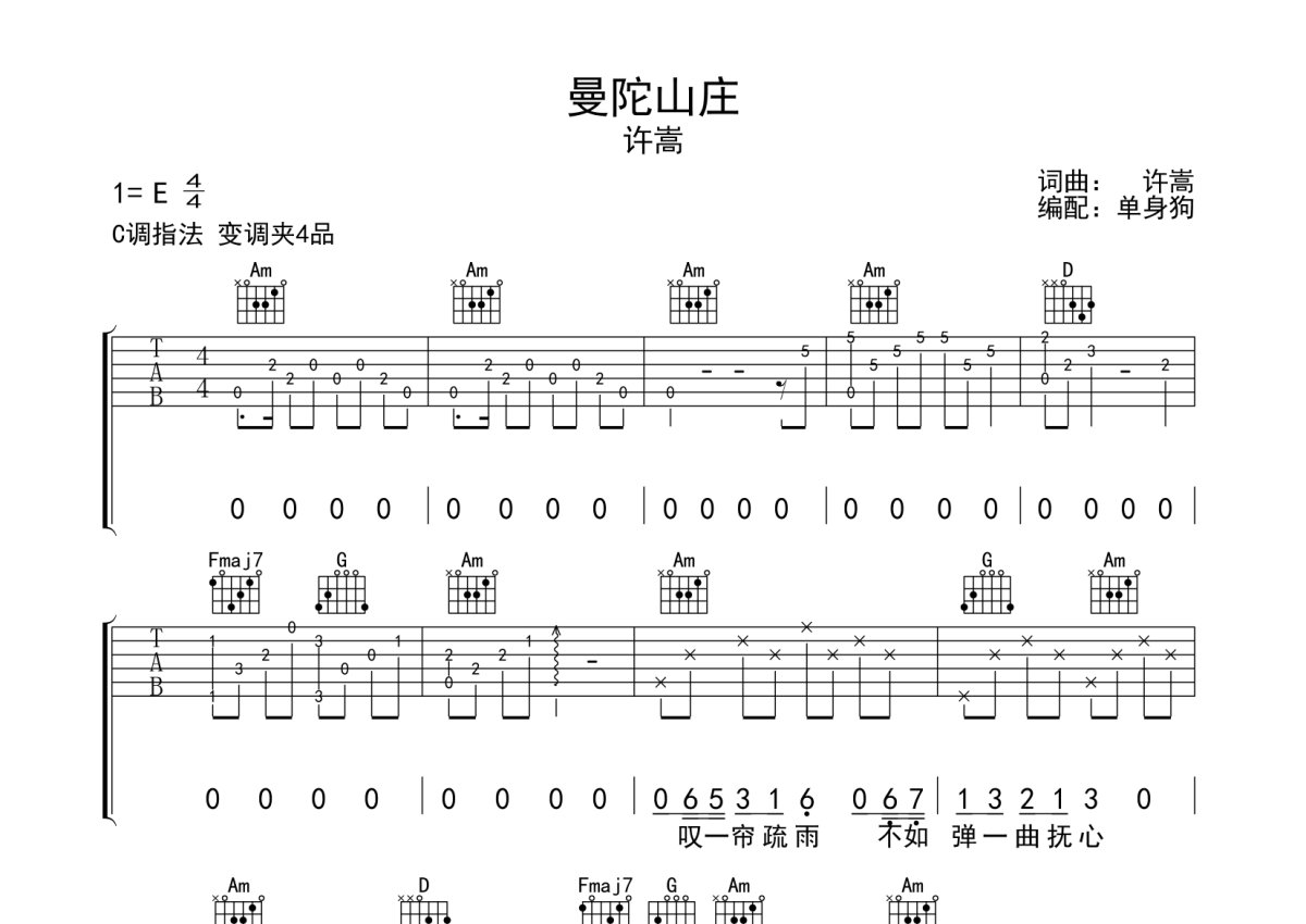 许嵩《曼陀山庄》吉他谱 - C调弹唱六线谱