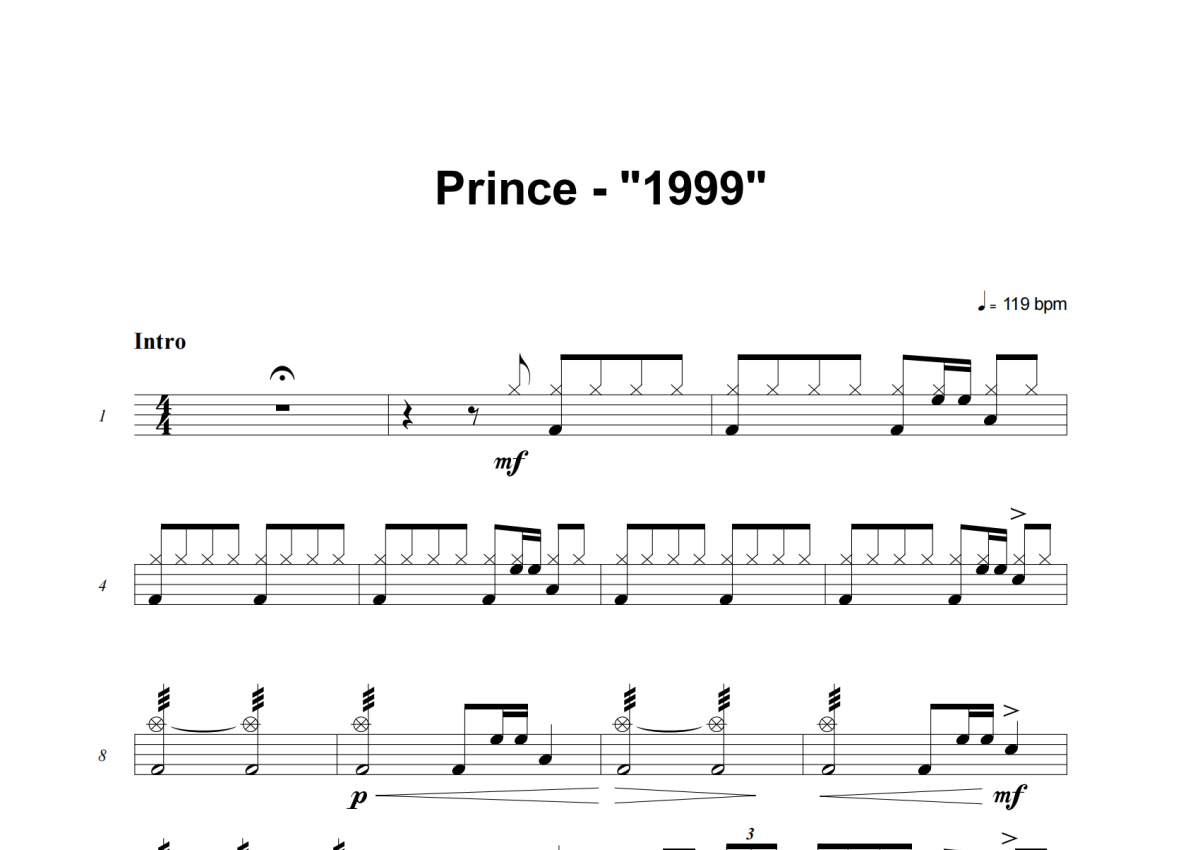 《1999》是Prince演唱的一首歌曲,这份架子鼓谱共有六张高清图谱,图谱由 @失眠的土豆 编配上传,图谱使用五线谱编配,使用这份1999架子鼓谱,你将能够轻松地敲打出这首Prince的1999,快来尝试吧。