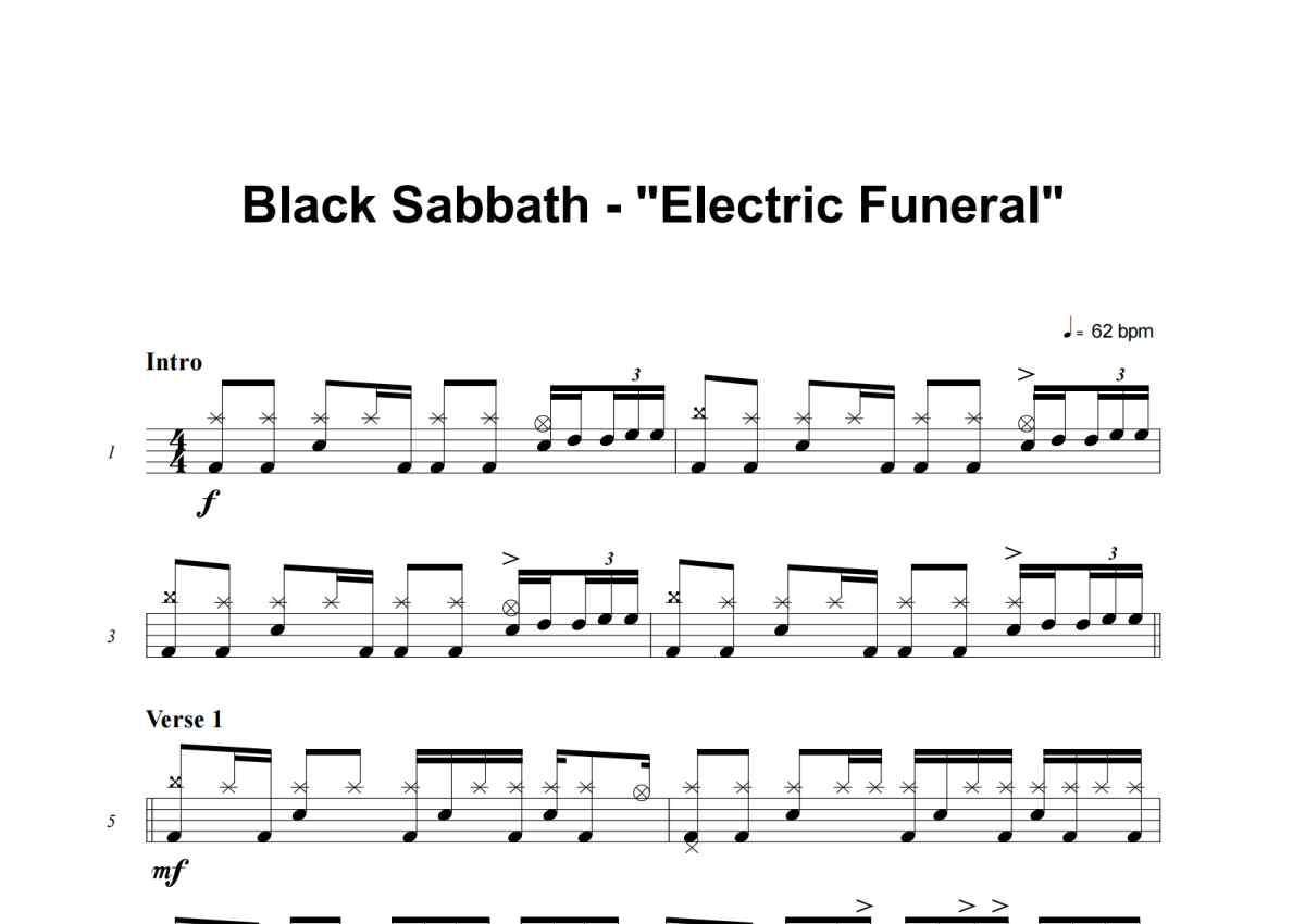 《Electric Funeral》是Black Sabbath演唱的一首歌曲,这份架子鼓谱共有五张高清图谱,图谱由 @失眠的土豆 编配上传,图谱使用五线谱编配,使用这份Electric Funeral架子鼓谱,你将能够轻松地敲打出这首Black Sabbath的Electric Funeral,快来尝试吧。