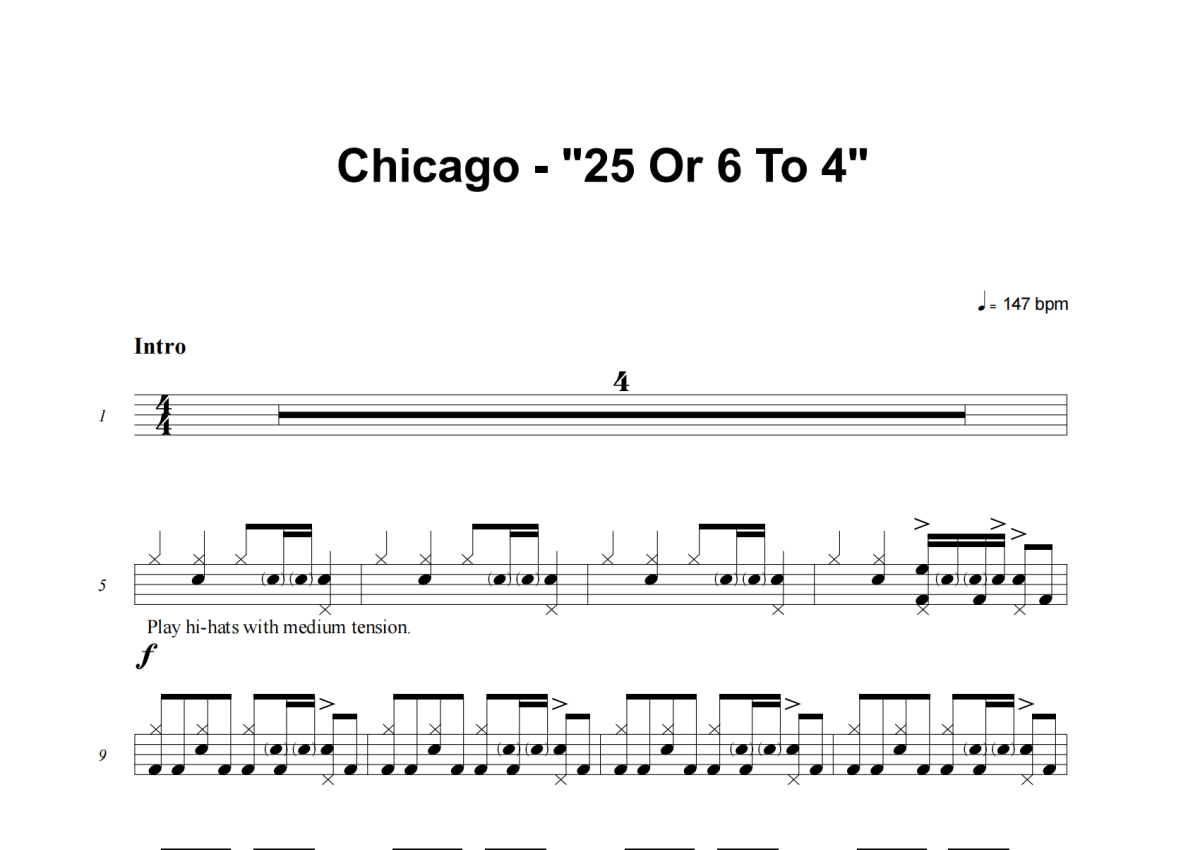 《25 Or 6 To 4》是Chicago演唱的一首歌曲,这份架子鼓谱共有六张高清图谱,图谱由 @失眠的土豆 编配上传,图谱使用五线谱编配,使用这份25 Or 6 To 4架子鼓谱,你将能够轻松地敲打出这首Chicago的25 Or 6 To 4,快来尝试吧。