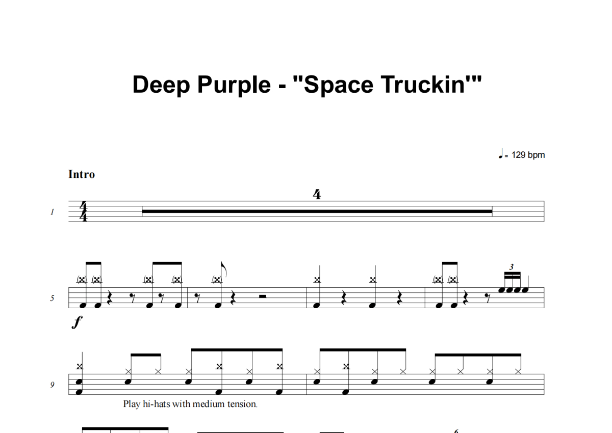 《Space Truckin'》是Deep Purple演唱的一首歌曲,这份架子鼓谱共有九张高清图谱,图谱由 @失眠的土豆 编配上传,图谱使用五线谱编配,使用这份Space Truckin'架子鼓谱,你将能够轻松地敲打出这首Deep Purple的Space Truckin',快来尝试吧。