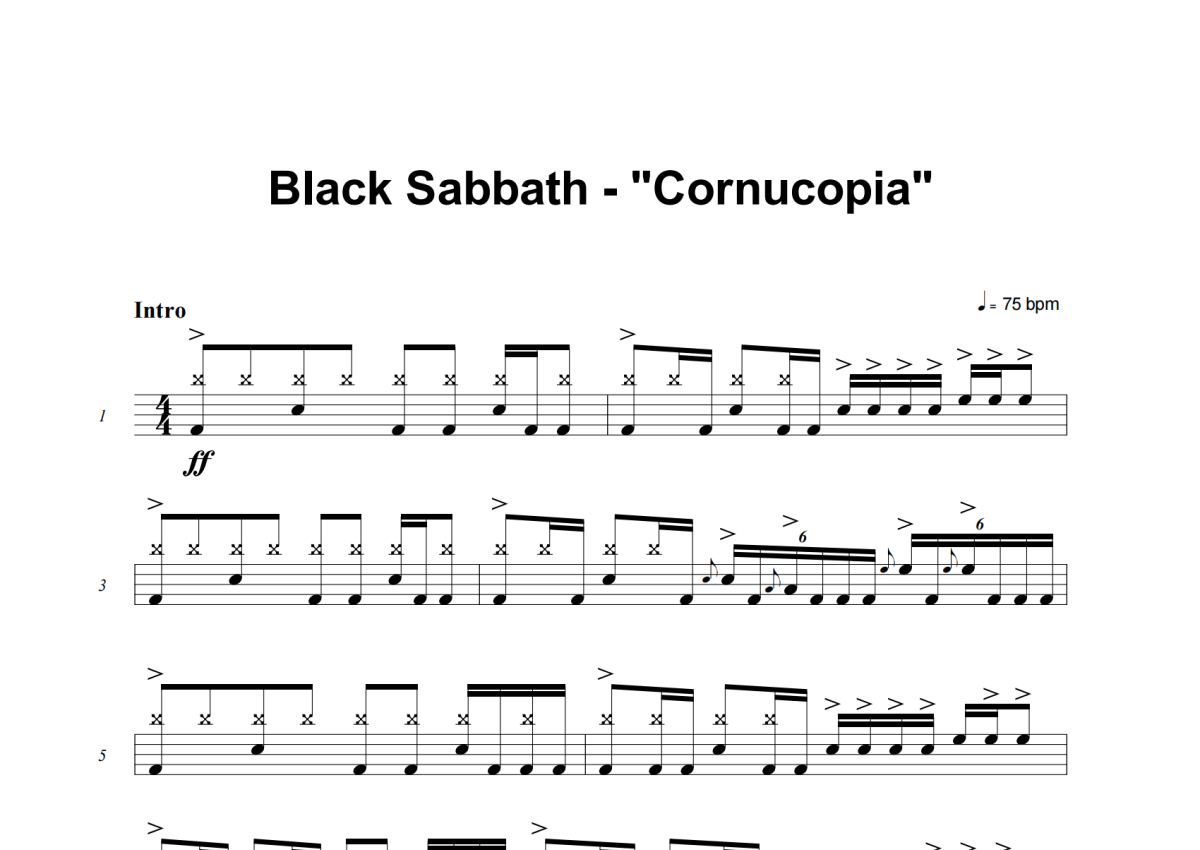 《Cornucopia》是Black Sabbath演唱的一首歌曲,这份架子鼓谱共有六张高清图谱,图谱由 @老虎不说谎 编配上传,图谱使用五线谱编配,使用这份Cornucopia架子鼓谱,你将能够轻松地敲打出这首Black Sabbath的Cornucopia,快来尝试吧。