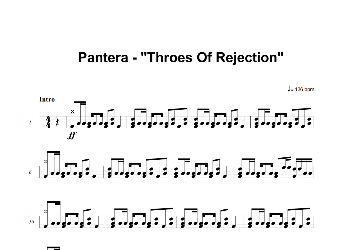 《Throes Of Rejection》是Pantera演唱的一首歌曲,这份架子鼓谱共有六张高清图谱,图谱由 @老虎不说谎 编配上传,图谱使用五线谱编配,使用这份Throes Of Rejection架子鼓谱,你将能够轻松地敲打出这首Pantera的Throes Of Rejection,快来尝试吧。