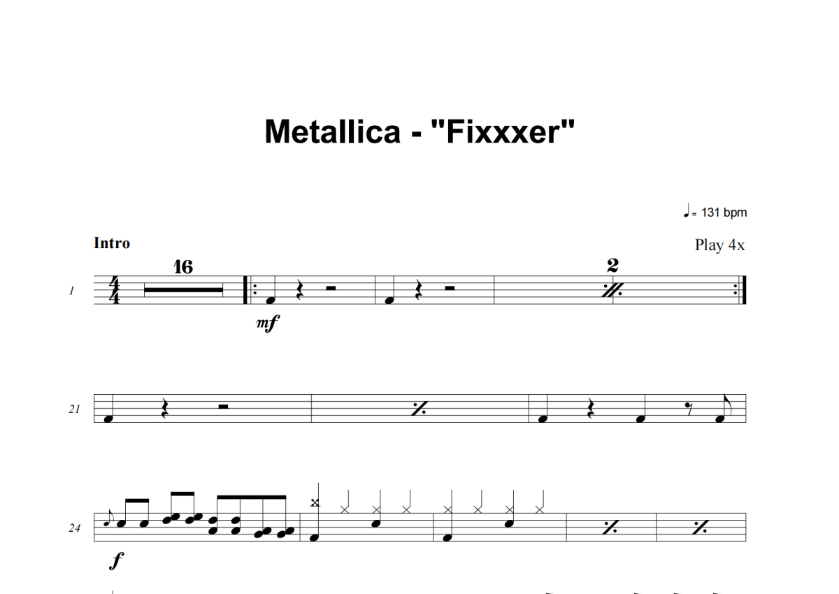 《Fixxxer》是Metallica演唱的一首歌曲,这份架子鼓谱共有七张高清图谱,图谱由 @老虎不说谎 编配上传,图谱使用五线谱编配,使用这份Fixxxer架子鼓谱,你将能够轻松地敲打出这首Metallica的Fixxxer,快来尝试吧。