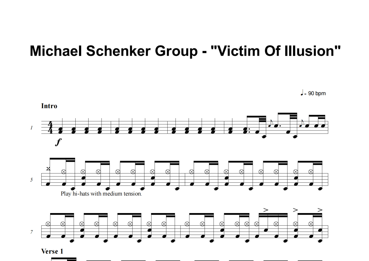 《Victim Of Illusion》是Michael Schenker Group演唱的一首歌曲,这份架子鼓谱共有六张高清图谱,图谱由 @老虎不说谎 编配上传,图谱使用五线谱编配,使用这份Victim Of Illusion架子鼓谱,你将能够轻松地敲打出这首Michael Schenker Group的Victim Of Illusion,快来尝试吧。