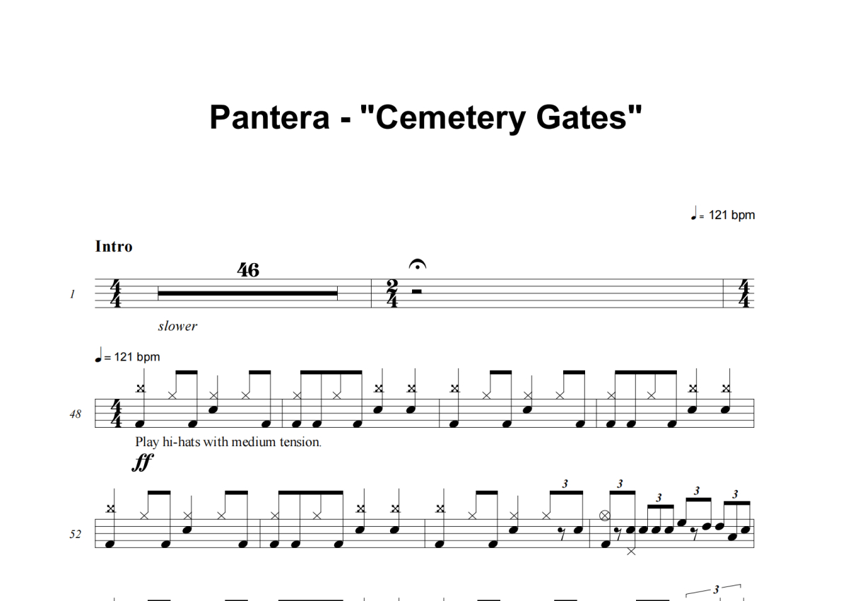 《Cemetery Gates》是Pantera演唱的一首歌曲,这份架子鼓谱共有七张高清图谱,图谱由 @老虎不说谎 编配上传,图谱使用五线谱编配,使用这份Cemetery Gates架子鼓谱,你将能够轻松地敲打出这首Pantera的Cemetery Gates,快来尝试吧。