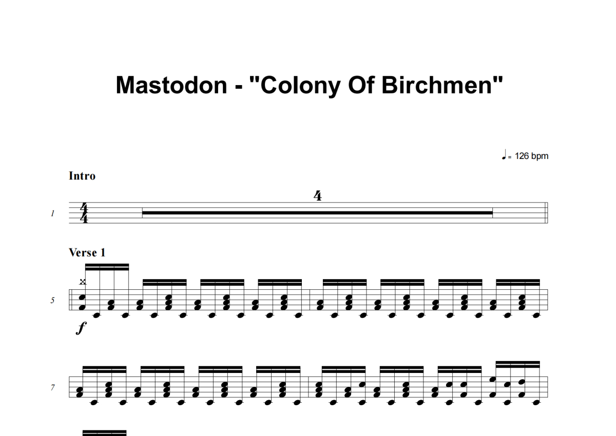 《Colony Of Birchmen》是Mastodon演唱的一首歌曲,这份架子鼓谱共有八张高清图谱,图谱由 @老虎不说谎 编配上传,图谱使用五线谱编配,使用这份Colony Of Birchmen架子鼓谱,你将能够轻松地敲打出这首Mastodon的Colony Of Birchmen,快来尝试吧。