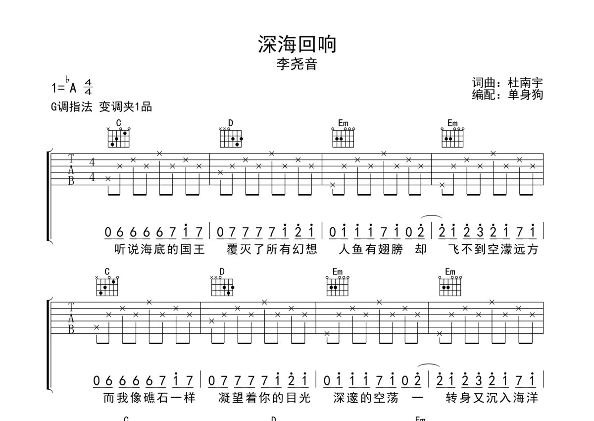 李尧音《深海回响》吉他谱 - G调弹唱六线谱