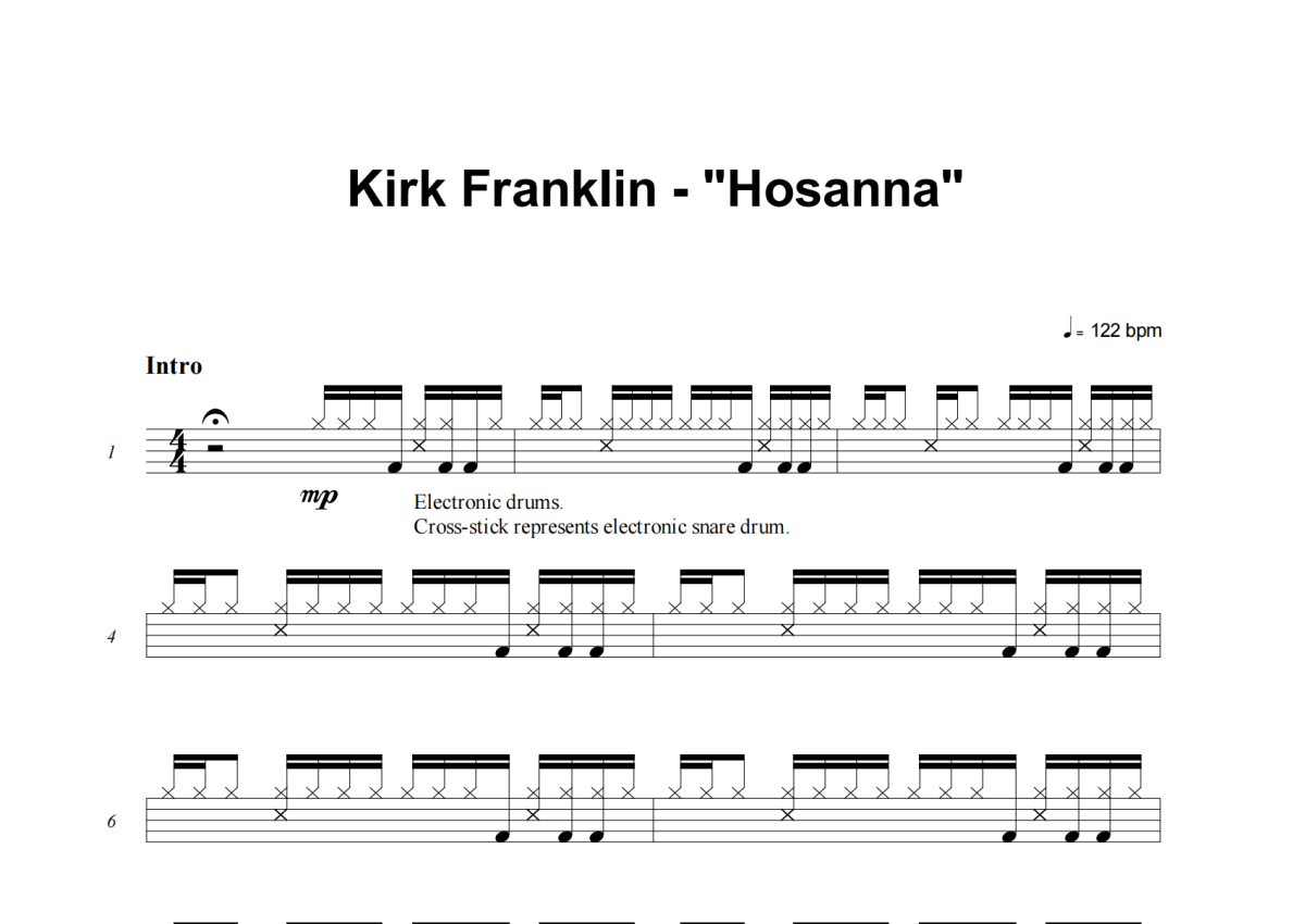 《Hosanna》是Kirk Franklin演唱的一首歌曲,这份架子鼓谱共有九张高清图谱,图谱由 @老虎不说谎 编配上传,图谱使用五线谱编配,使用这份Hosanna架子鼓谱,你将能够轻松地敲打出这首Kirk Franklin的Hosanna,快来尝试吧。