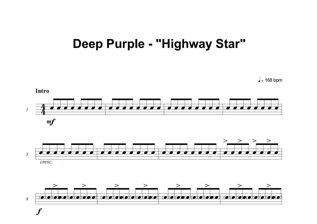 《Highway Star》是Deep Purple演唱的一首歌曲,这份架子鼓谱共有八张高清图谱,图谱由 @老虎不说谎 编配上传,图谱使用五线谱编配,使用这份Highway Star架子鼓谱,你将能够轻松地敲打出这首Deep Purple的Highway Star,快来尝试吧。
