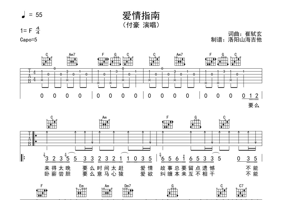 付豪《爱情指南》吉他谱 - C调弹唱六线谱