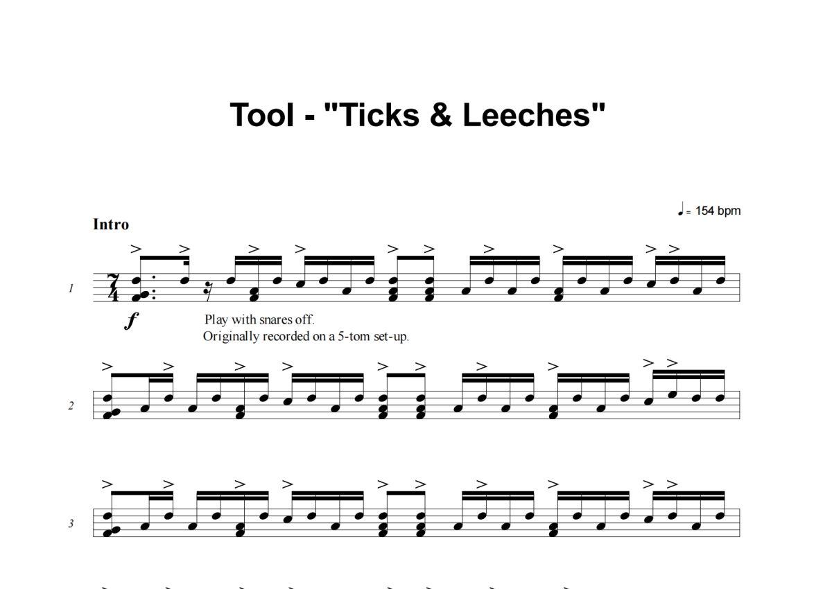 《Ticks & Leeches》是Tool演唱的一首歌曲,这份架子鼓谱共有十二张高清图谱,图谱由 @积极处世 编配上传,图谱使用五线谱编配,使用这份Ticks & Leeches架子鼓谱,你将能够轻松地敲打出这首Tool的Ticks & Leeches,快来尝试吧。