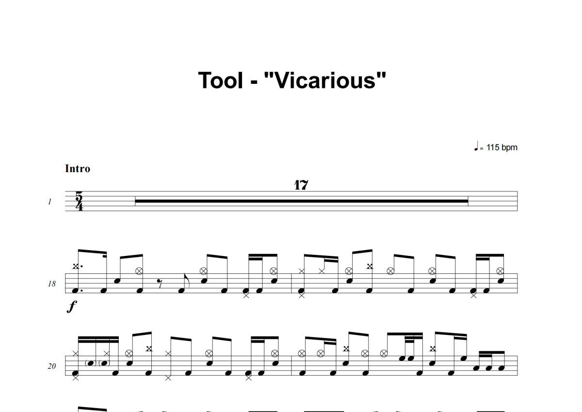 《Vicarious》是Tool演唱的一首歌曲,这份架子鼓谱共有九张高清图谱,图谱由 @积极处世 编配上传,图谱使用五线谱编配,使用这份Vicarious架子鼓谱,你将能够轻松地敲打出这首Tool的Vicarious,快来尝试吧。