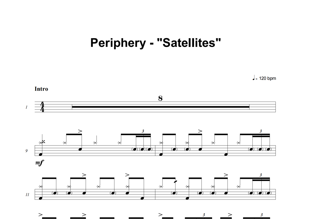《Satellites》是Periphery演唱的一首歌曲,这份架子鼓谱共有十三张高清图谱,图谱由 @积极处世 编配上传,图谱使用五线谱编配,使用这份Satellites架子鼓谱,你将能够轻松地敲打出这首Periphery的Satellites,快来尝试吧。