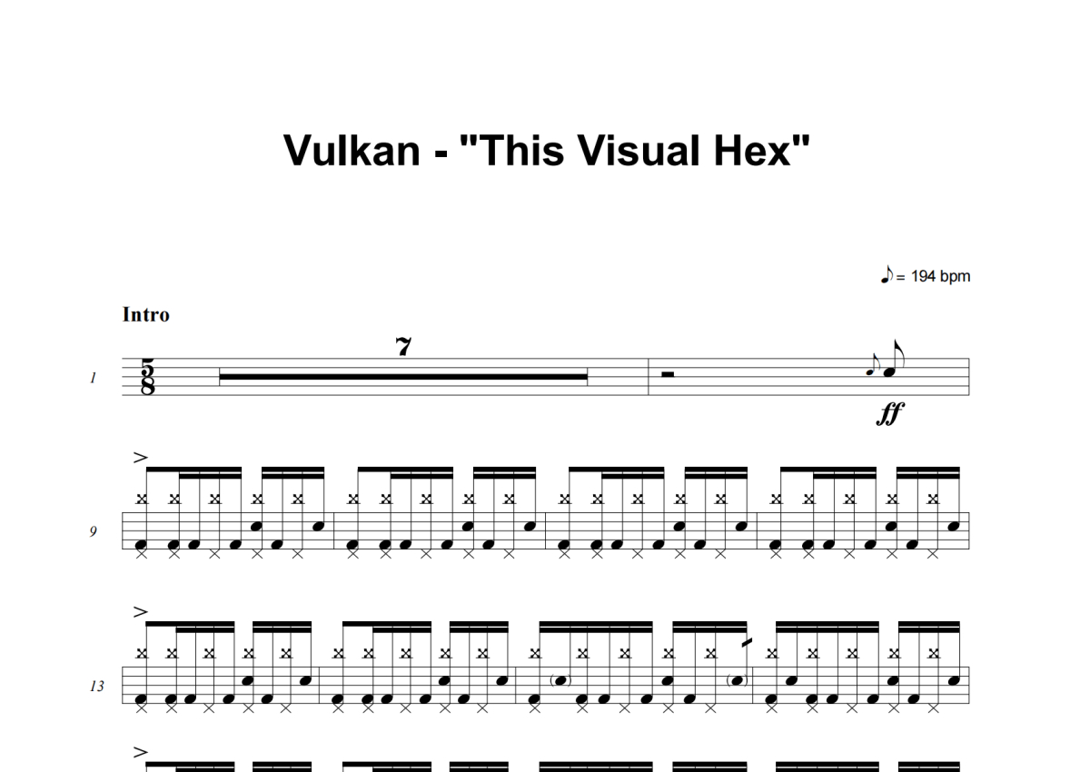 《This Visual Hex》是Vulkan演唱的一首歌曲,这份架子鼓谱共有十四张高清图谱,图谱由 @积极处世 编配上传,图谱使用五线谱编配,使用这份This Visual Hex架子鼓谱,你将能够轻松地敲打出这首Vulkan的This Visual Hex,快来尝试吧。